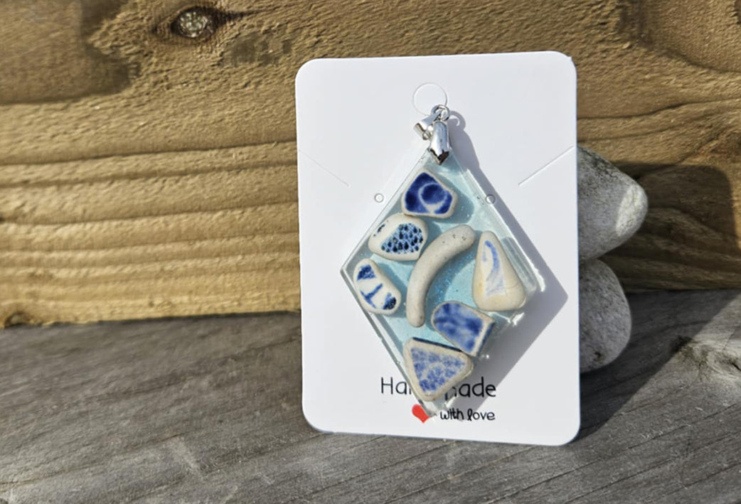 Resin blended seaglass and found pottery to create a beautiful and unique piece of hand made jewellery.