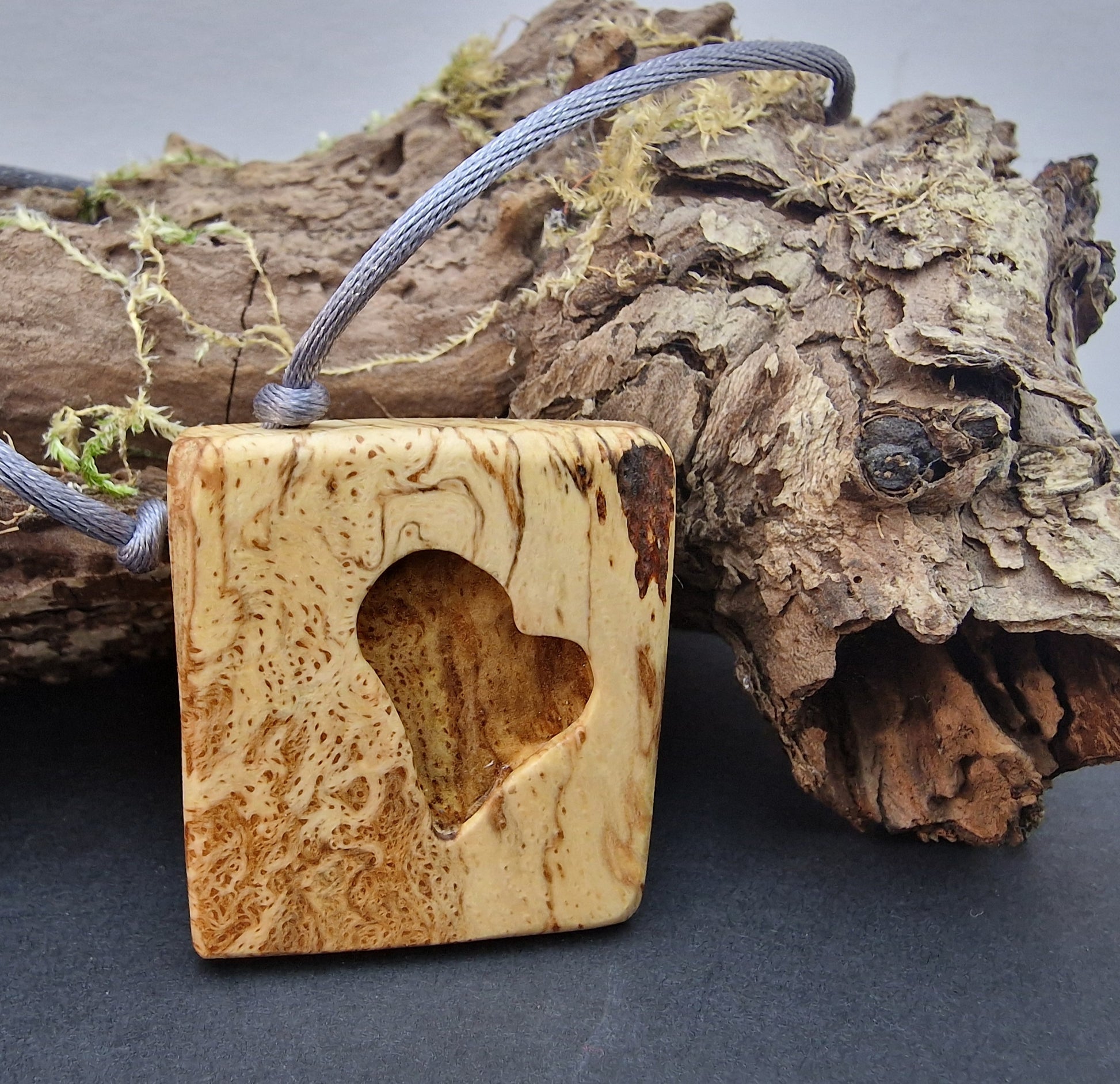 Carved Scottish Beechwood creating a beautiful and unique piece of hand made jewellery. Supplied with a nylon cord