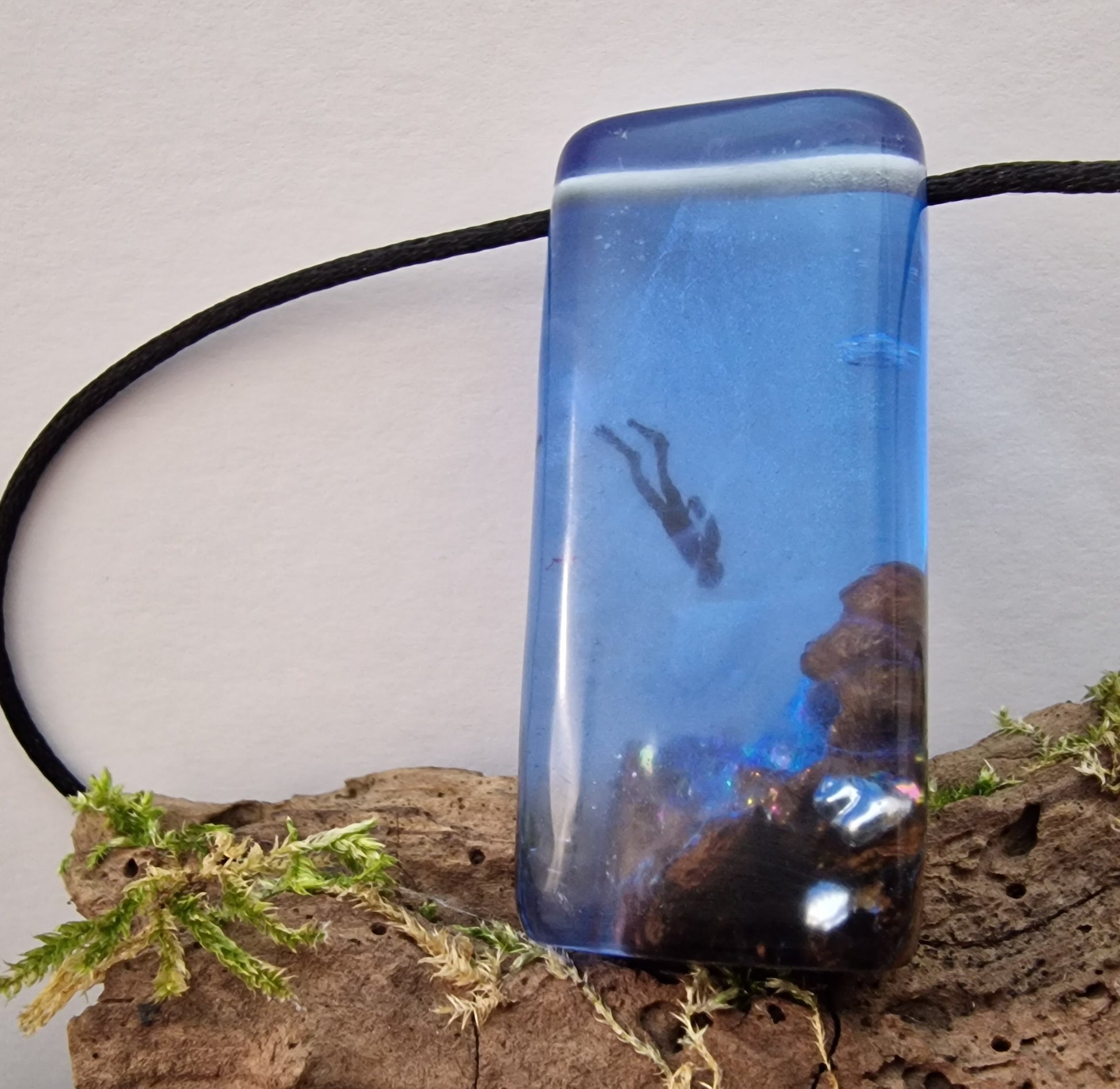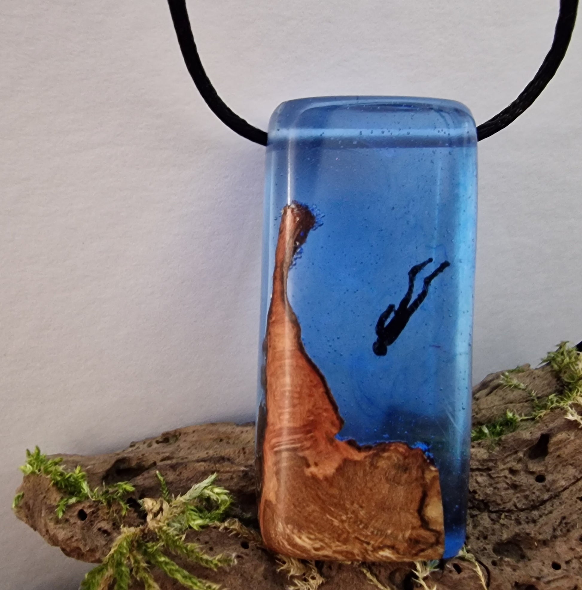 Resin blended with Scottish wood to create a beautiful underwater scene and unique piece of hand made jewellery. Supplied with a nylon cord