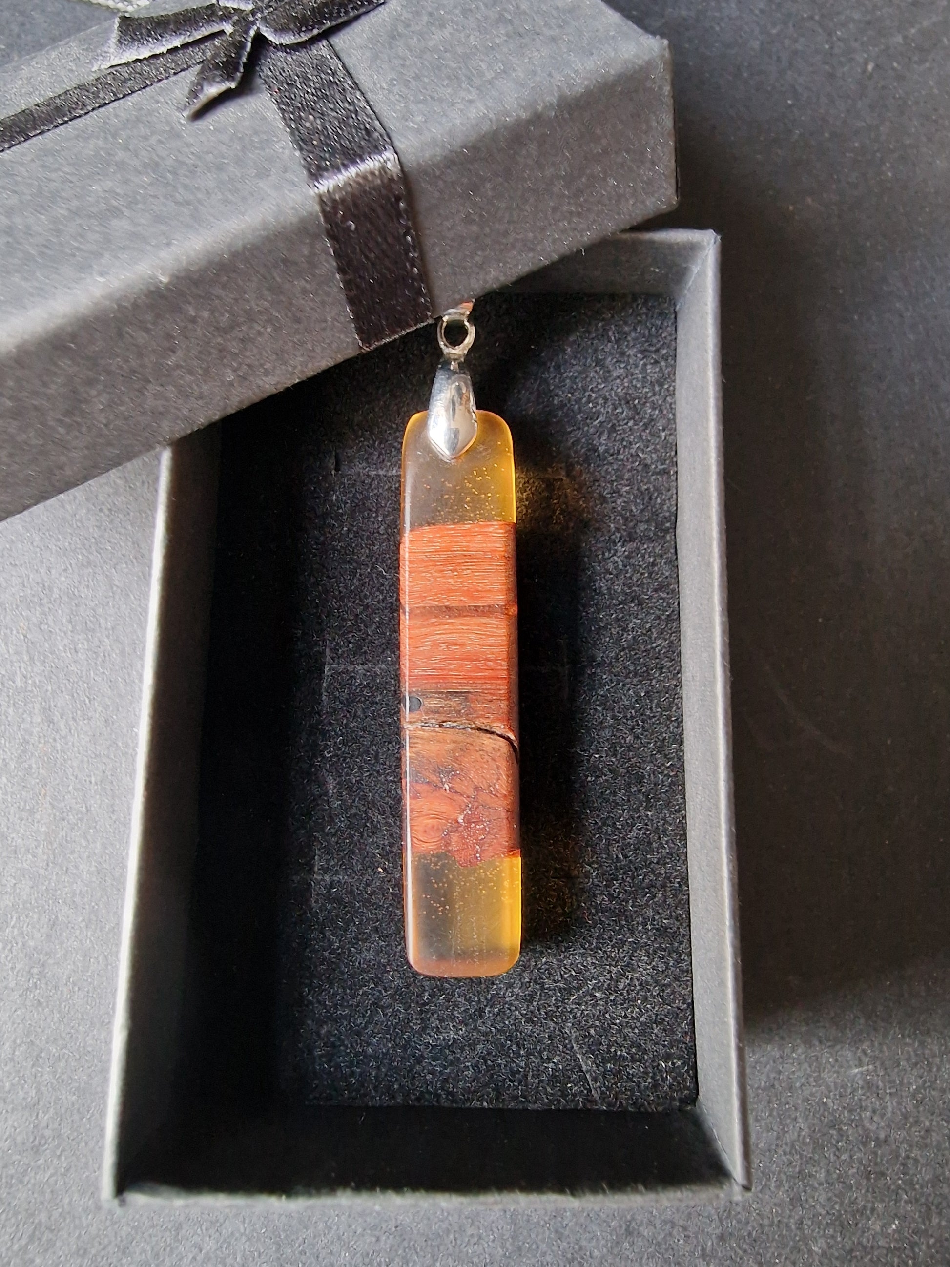 Resin blended with Australian hardwood to create a beautiful and unique piece of hand made jewellery.