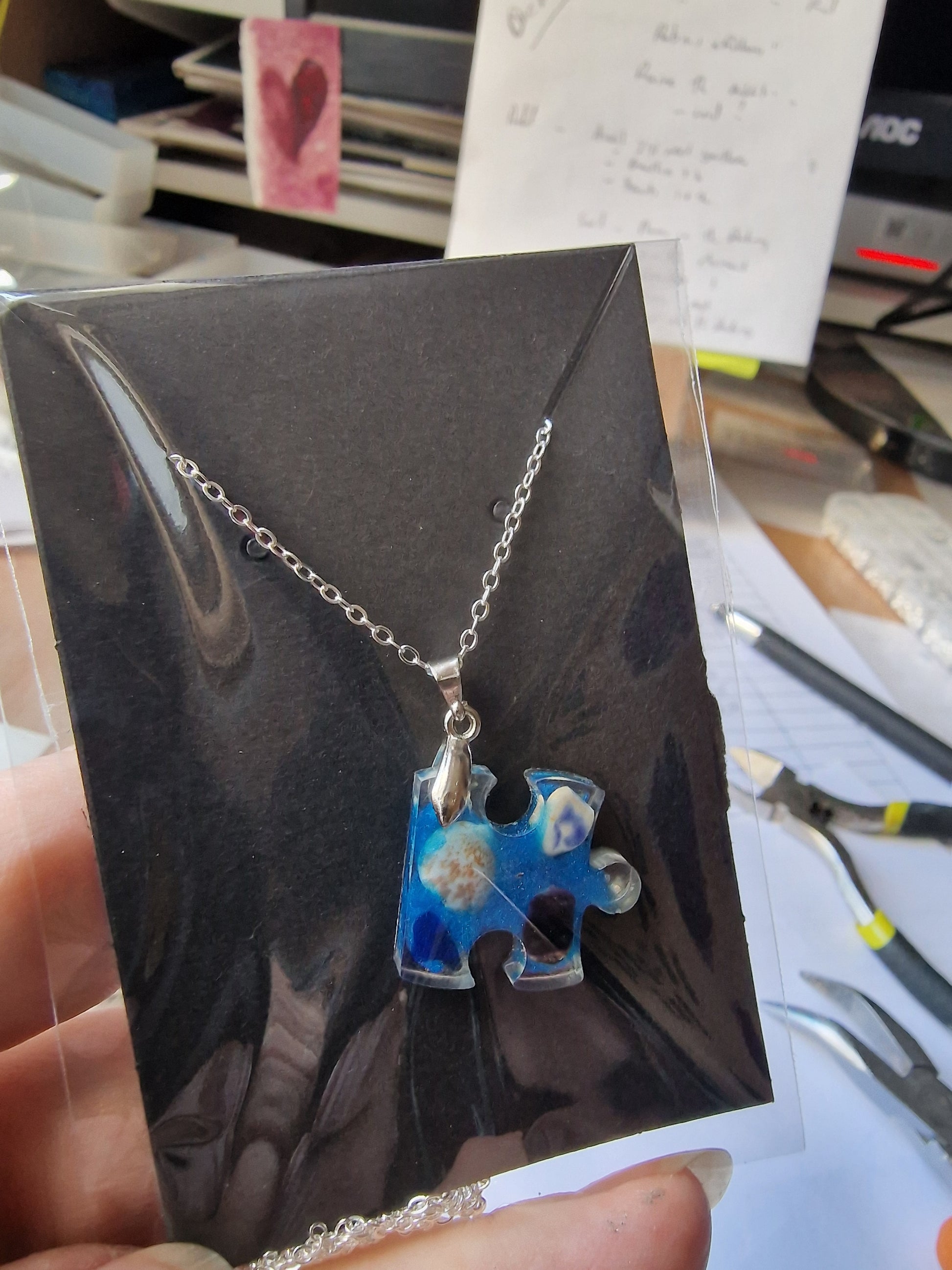 Resin blended seaglass and found pottery to create a beautiful and unique piece of hand made jewellery.